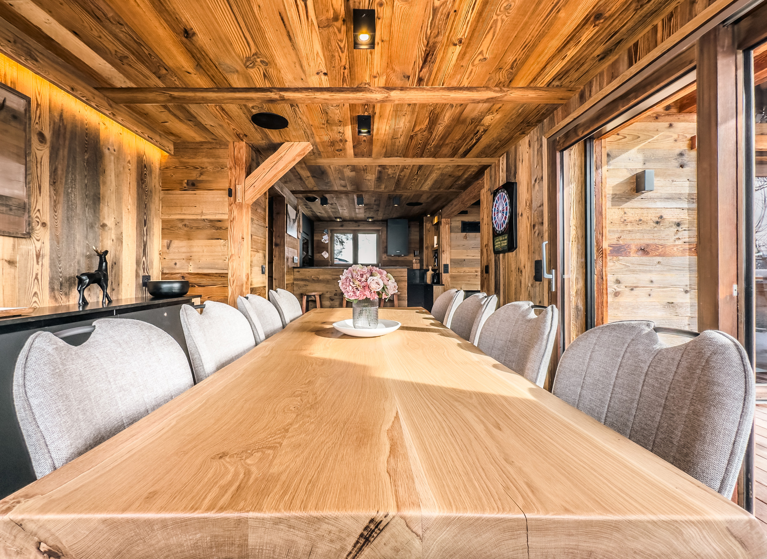 - the living room, consisting of an equipped kitchen (dishwasher, fridge freezer, kettle, toaster, Nespresso and filter coffee machine, raclette machine, crepes party, baby/child dishes, etc.) over the dining room and living room, occupies the entire upper floor of the chalet. Bathed in light thanks to its numerous openings, it faces southwest and gives access to a terrace. From the jacuzzi or the outdoor furniture, you can admire the breathtaking view of the village and the neighboring mountains.