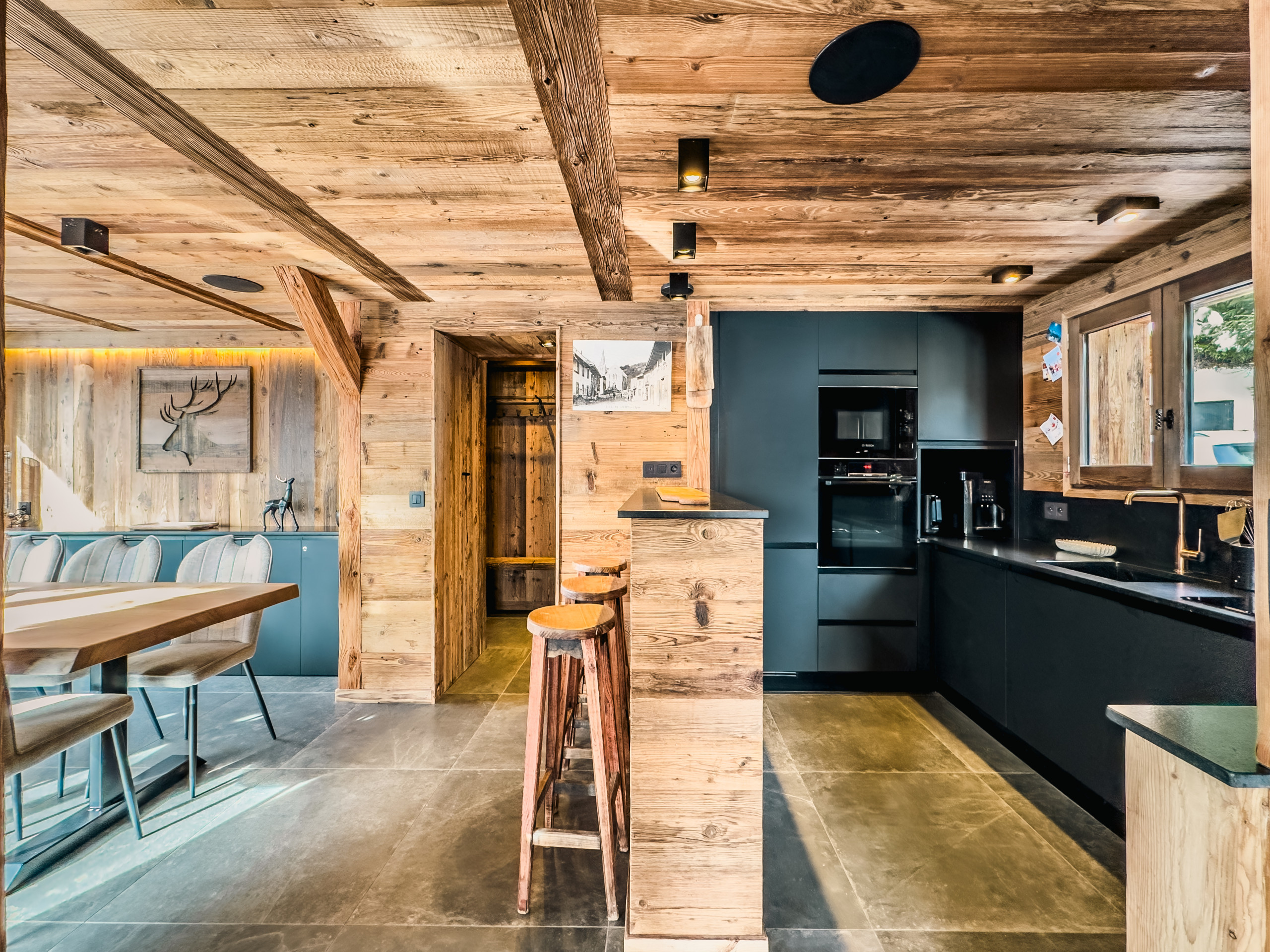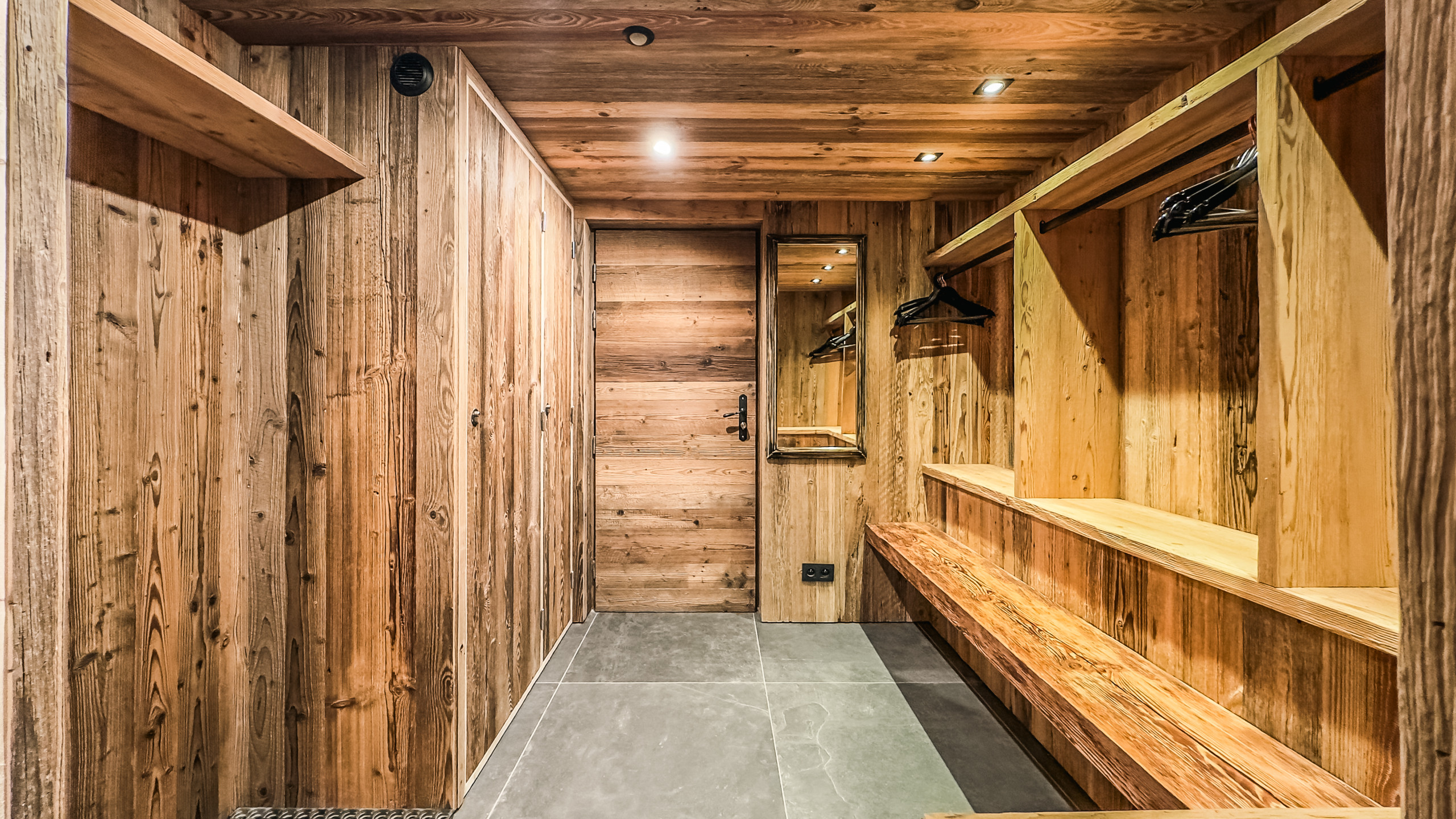 - the chalet opens onto a large entrance with cupboard, an adjoining storage room and the ski room in its continuity.