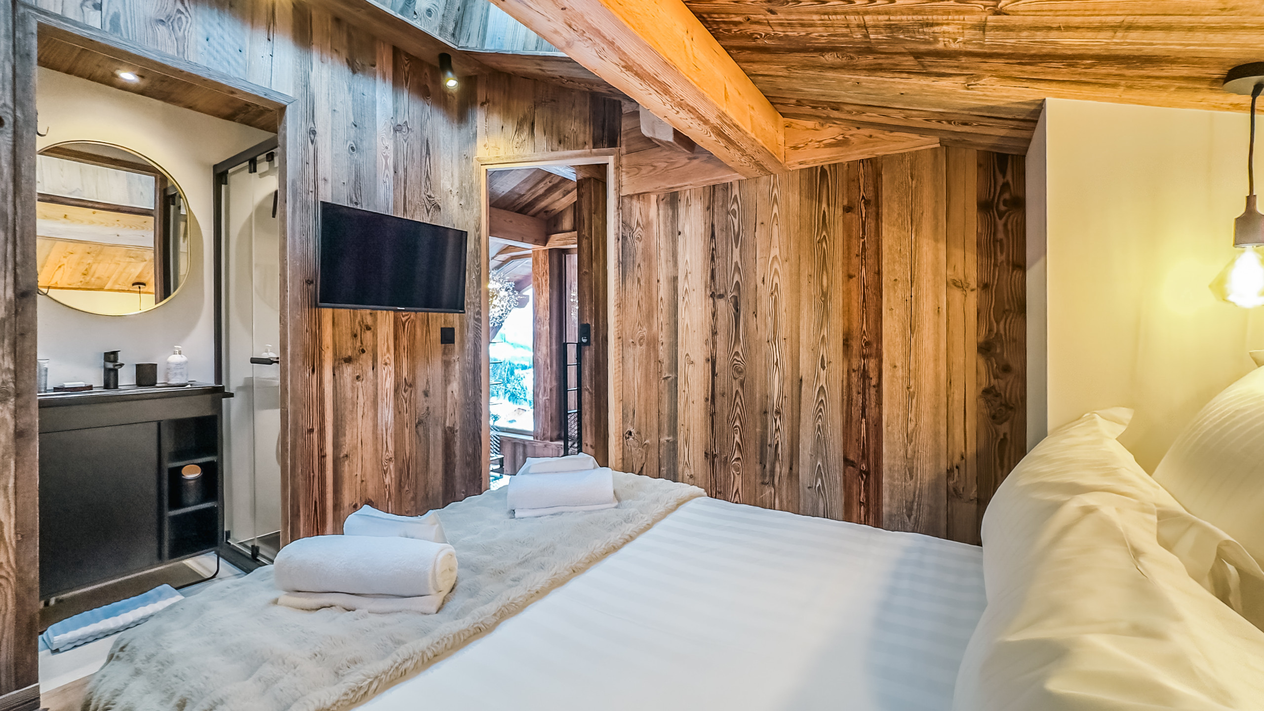 - a glass door provides access to the chalet's small garden where the bubble sauna is located surrounded by fir trees.