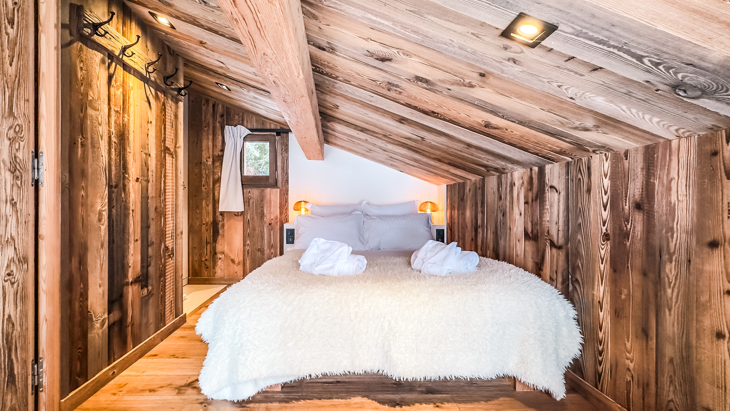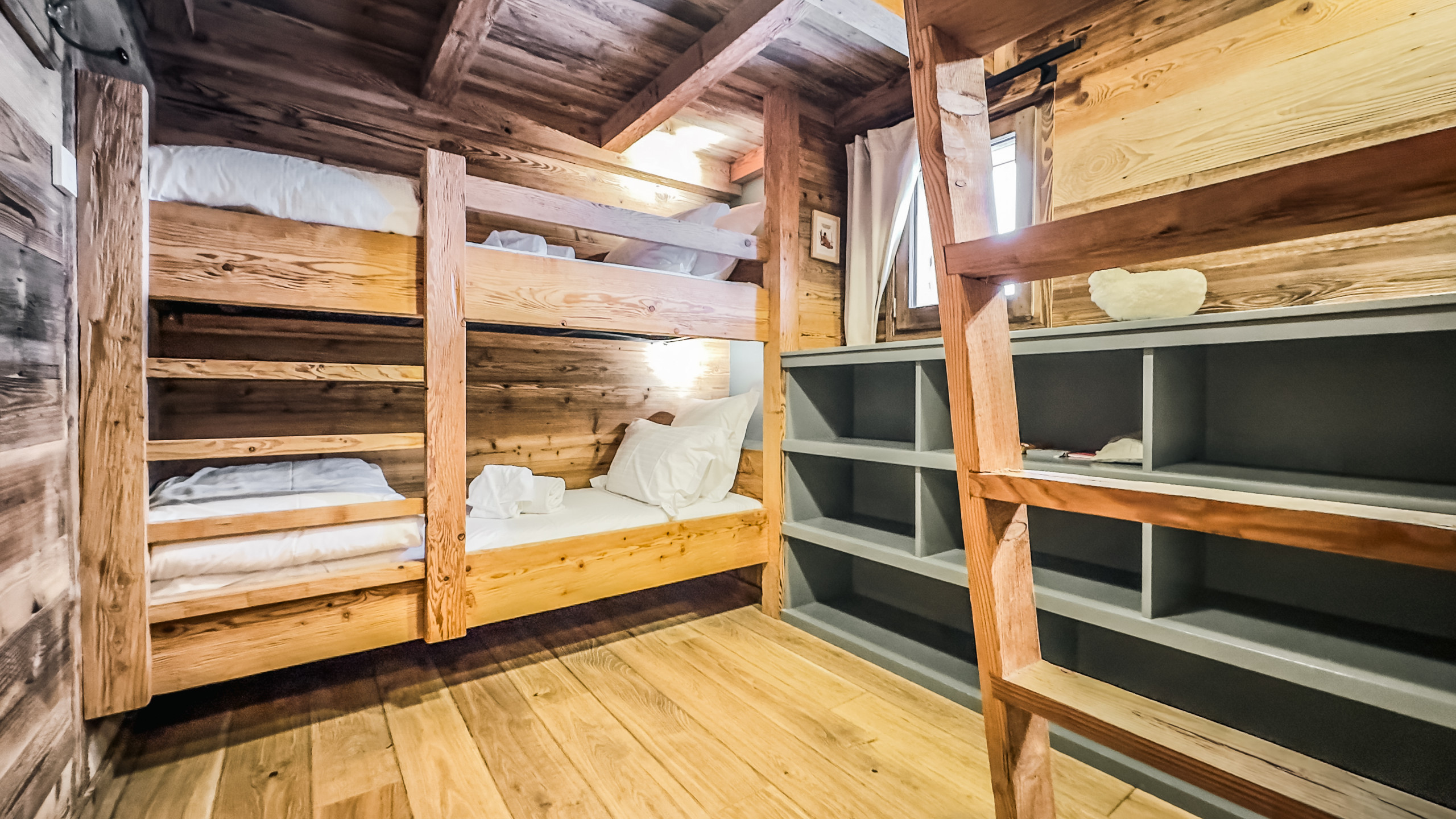 - les 3 autres chambres du chalet se situent sur ce niveau. La première possède un lit Queen size (160*200), un grand placard de rangement et une baie vitrée s’ouvrant sur une terrasse en bois et le jardin. La deuxième a 2 lits simples (80*200), qui peuvent être attachés pour former (sur demande) un lit Queen size (160*200), et un grand placard. La troisième est dotée de deux lits simples superposés (80*190) avec grands tiroirs de rangement. A noter que cette dernière est borgne et ne possède donc pas d’ouverture sur l’extérieur.