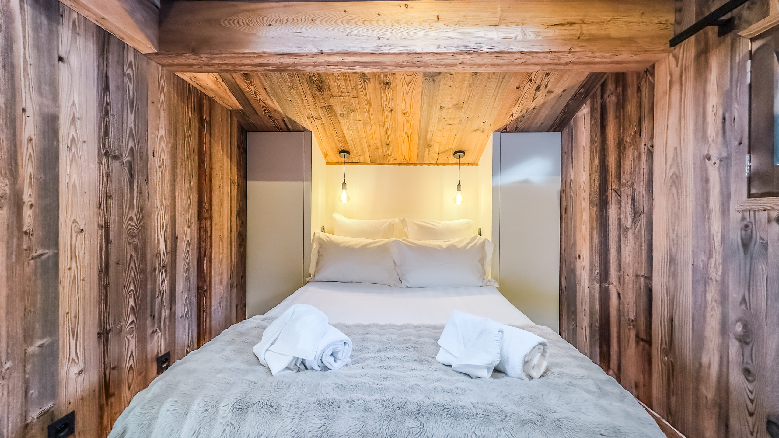 - de 3 andere slaapkamers van het chalet bevinden zich op dit niveau. De eerste heeft een queensize bed (160*200), een grote opbergkast en een erker die uitkomt op een houten terras en de tuin. De tweede heeft 2 eenpersoonsbedden (80*200), die op verzoek kunnen worden samengevoegd tot een queensize bed (160*200), en een grote kast. De derde heeft twee eenpersoonsstapelbedden (80*190) met grote opberglades. Let op, deze laatste is blind en heeft dus geen opening naar buiten.