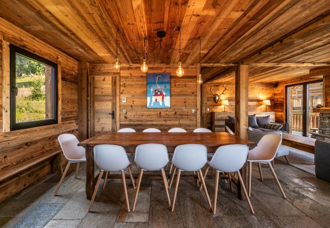 - 1er étage : la pièce de vie s'ouvre sur le salon organisé autour de la cheminée et de larges baies vitrées, avec vue imprenable sur les pistes de ski. Dans son prolongement, un bel espace pour la prise des repas, puis la cuisine équipée qui offre une vue panoramique sur les montagnes environnantes. Dans son prolongement, une vaste terrasse abritée avec vue dégagée.
